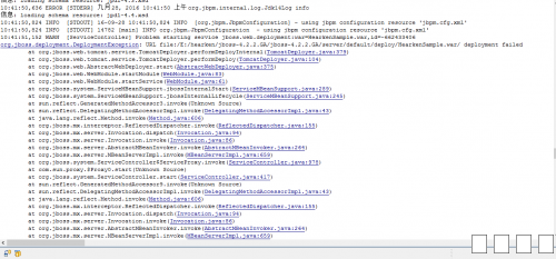 10:41:50,824 INFO [STDOUT] 14782 [main] INFO org.jbpm.JbpmConfiguration - using jbpm configuration resource 'jbpm.cfg.xml' 10:41:51,152 WARN [ServiceController] Problem starting service jboss.web.deployment:war=HearkenSample.war,id=-662433406 org.jboss.deployment.DeploymentException: URL file:/E:/hearken/jboss-4.2.2.GA/jboss-4.2.2.GA/server/default/deploy/HearkenSample.war/ deployment failed at org.jboss.web.tomcat.service.TomcatDeployer.performDeployInternal(TomcatDeployer.java:379) at org.jboss.web.tomcat.service.TomcatDeployer.performDeploy(TomcatDeployer.java:104) at org.jboss.web.AbstractWebDeployer.start(AbstractWebDeployer.java:375) at org.jboss.web.WebModule.startModule(WebModule.java:83) at org.jboss.web.WebModule.startService(WebModule.java:61) at org.jboss.system.ServiceMBeanSupport.jbossInternalStart(ServiceMBeanSupport.java:289) at org.jboss.system.ServiceMBeanSupport.jbossInternalLifecycle(ServiceMBeanSupport.java:245) at sun.reflect.GeneratedMethodAccessor3.invoke(Unknown Source) at sun.reflect.DelegatingMethodAccessorImpl.invoke(DelegatingMethodAccessorImpl.java:43) at java.lang.reflect.Method.invoke(Method.java:606) at org.jboss.mx.interceptor.ReflectedDispatcher.invoke(ReflectedDispatcher.java:155) at org.jboss.mx.server.Invocation.dispatch(Invocation.java:94) at org.jboss.mx.server.Invocation.invoke(Invocation.java:86) at org.jboss.mx.server.AbstractMBeanInvoker.invoke(AbstractMBeanInvoker.java:264) at org.jboss.mx.server.MBeanServerImpl.invoke(MBeanServerImpl.java:659) at org.jboss.system.ServiceController$ServiceProxy.invoke(ServiceController.java:978) at com.sun.proxy.$Proxy0.start(Unknown Source) at org.jboss.system.ServiceController.start(ServiceController.java:417) at sun.reflect.GeneratedMethodAccessor9.invoke(Unknown Source) at sun.reflect.DelegatingMethodAccessorImpl.invoke(DelegatingMethodAccessorImpl.java:43) at java.lang.reflect.Method.invoke(Method.java:606) at org.jboss.mx.interceptor.ReflectedDispatcher.invoke(ReflectedDispatcher.java:155) at org.jboss.mx.server.Invocation.dispatch(Invocation.java:94) at org.jboss.mx.server.Invocation.invoke(Invocation.java:86) at org.jboss.mx.server.AbstractMBeanInvoker.invoke(AbstractMBeanInvoker.java:264) at org.jboss.mx.server.MBeanServerImpl.invoke(MBeanServerImpl.java:659) at org.jboss.mx.util.MBeanProxyExt.invoke(MBeanProxyExt.java:210) at com.sun.proxy.$Proxy25.start(Unknown Source) at org.jboss.web.AbstractWebContainer.start(AbstractWebContainer.java:466) at sun.reflect.NativeMethodAccessorImpl.invoke0(Native Method) at sun.reflect.NativeMethodAccessorImpl.invoke(NativeMethodAccessorImpl.java:57) at sun.reflect.DelegatingMethodAccessorImpl.invoke(DelegatingMethodAccessorImpl.java:43) at java.lang.reflect.Method.invoke(Method.java:606) at org.jboss.mx.interceptor.ReflectedDispatcher.invoke(ReflectedDispatcher.java:155) at org.jboss.mx.server.Invocation.dispatch(Invocation.java:94) at org.jboss.mx.interceptor.AbstractInterceptor.invoke(AbstractInterceptor.java:133) at org.jboss.mx.server.Invocation.invoke(Invocation.java:88) at org.jboss.mx.interceptor.ModelMBeanOperationInterceptor.invoke(ModelMBeanOperationInterceptor.java:142) at org.jboss.mx.interceptor.DynamicInterceptor.invoke(DynamicInterceptor.java:97) at org.jboss.mx.server.Invocation.invoke(Invocation.java:88) at org.jboss.mx.server.AbstractMBeanInvoker.invoke(AbstractMBeanInvoker.java:264) at org.jboss.mx.server.MBeanServerImpl.invoke(MBeanServerImpl.java:659) at org.jboss.mx.util.MBeanProxyExt.invoke(MBeanProxyExt.java:210) at com.sun.proxy.$Proxy26.start(Unknown Source) at org.jboss.deployment.MainDeployer.start(MainDeployer.java:1025) at org.jboss.deployment.MainDeployer.deploy(MainDeployer.java:819) at org.jboss.deployment.MainDeployer.deploy(MainDeployer.java:782) at sun.reflect.NativeMethodAccessorImpl.invoke0(Native Method) at sun.reflect.NativeMethodAccessorImpl.invoke(NativeMethodAccessorImpl.java:57) at sun.reflect.DelegatingMethodAccessorImpl.invoke(DelegatingMethodAccessorImpl.java:43) at java.lang.reflect.Method.invoke(Method.java:606) at org.jboss.mx.interceptor.ReflectedDispatcher.invoke(ReflectedDispatcher.java:155) at org.jboss.mx.server.Invocation.dispatch(Invocation.java:94) at org.jboss.mx.interceptor.AbstractInterceptor.invoke(AbstractInterceptor.java:133) at org.jboss.mx.server.Invocation.invoke(Invocation.java:88) at org.jboss.mx.interceptor.ModelMBeanOperationInterceptor.invoke(ModelMBeanOperationInterceptor.java:142) at org.jboss.mx.server.Invocation.invoke(Invocation.java:88) at org.jboss.mx.server.AbstractMBeanInvoker.invoke(AbstractMBeanInvoker.java:264) at org.jboss.mx.server.MBeanServerImpl.invoke(MBeanServerImpl.java:659) at org.jboss.mx.util.MBeanProxyExt.invoke(MBeanProxyExt.java:210) at com.sun.proxy.$Proxy9.deploy(Unknown Source) at org.jboss.deployment.scanner.URLDeploymentScanner.deploy(URLDeploymentScanner.java:421) at org.jboss.deployment.scanner.URLDeploymentScanner.scan(URLDeploymentScanner.java:634) at org.jboss.deployment.scanner.AbstractDeploymentScanner$ScannerThread.doScan(AbstractDeploymentScanner.java:263) at org.jboss.deployment.scanner.AbstractDeploymentScanner.startService(AbstractDeploymentScanner.java:336) at org.jboss.system.ServiceMBeanSupport.jbossInternalStart(ServiceMBeanSupport.java:289) at org.jboss.system.ServiceMBeanSupport.jbossInternalLifecycle(ServiceMBeanSupport.java:245) at sun.reflect.GeneratedMethodAccessor3.invoke(Unknown Source) at sun.reflect.DelegatingMethodAccessorImpl.invoke(DelegatingMethodAccessorImpl.java:43) at java.lang.reflect.Method.invoke(Method.java:606) at org.jboss.mx.interceptor.ReflectedDispatcher.invoke(ReflectedDispatcher.java:155) at org.jboss.mx.server.Invocation.dispatch(Invocation.java:94) at org.jboss.mx.server.Invocation.invoke(Invocation.java:86) at org.jboss.mx.server.AbstractMBeanInvoker.invoke(AbstractMBeanInvoker.java:264) at org.jboss.mx.server.MBeanServerImpl.invoke(MBeanServerImpl.java:659) at org.jboss.system.ServiceController$ServiceProxy.invoke(Ser