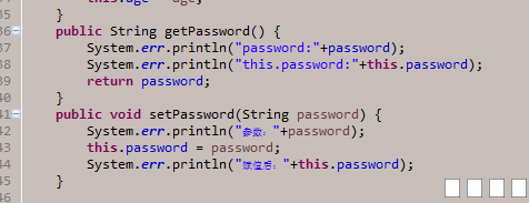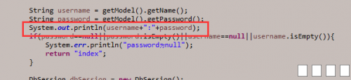 public class User { private String username; private String password; public String getUsername() { return username; } public void setUsername(String username) { this.username = username; } public String getPassword() { return password; } public void setPassword(String password) { this.password = password; } } 2.在使用Set获取表单传入的参数值时,使用user.getPassword()获取的值为null,但在user的setPassword()中传入的值为表单提交的值。 public class LoginAction_Set extends ActionSupport { private User user; public void setUser(User user) { this.user = user; } @Override public String execute() throws Exception { // TODO Auto-generated method stub String username = user.getUsername(); //user自带的getPassword()此时赋值为null? String password = user.getPassword(); if(password==null||password.isEmpty()||username==null||username.isEmpty()){ System.err.println("password为null"); return null; } DbSession dbSession = new DbSession(); String sql = "select id from user where name=? and password=?"; List list = dbSession.queryBaseInfo(sql, username, password); if(list.size() == 1){ return "success"; }else{ return "index"; } } } |
