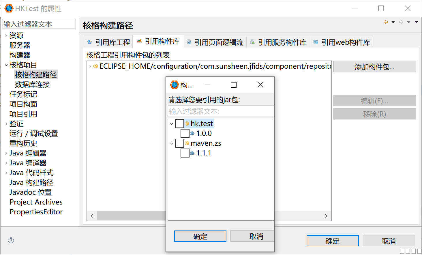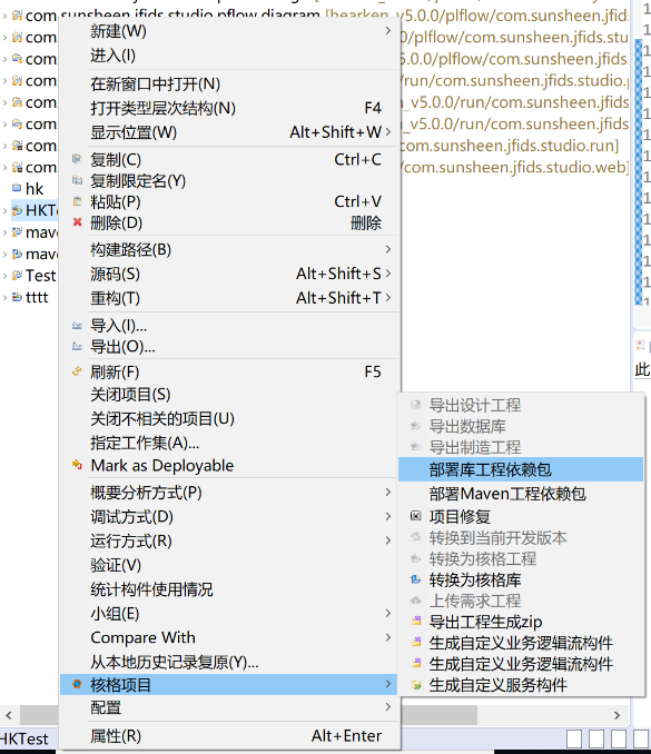步骤: 1.右键项目(以核格maven库工程为例)-->导出-->jar文件 图片:O(3FFDPB[3]A4GP%)V]J$_5.png 2.导出后手挡放入平台安装目录下-->\configuration\com.sunsheen.jfids\component\repository\xx.xx\x.x.x(repository后面的两层目录为自己手动新建,第一层为xx.xx格式,第二层为版本号,纯数字格式。例如\configuration\com.sunsheen.jfids\component\repository\hk.test\1.0.0)。 3.右键核格项目(即主工程)-->属性-->核格项目-->核格构件路径-->引用构件库-->添加 图片:%SR380S1~O]@(6]1}766)HA.png 4.部署项目到服务器。 5.启动服务器。该步和下一步(第6步不分先后) 6.右键核格项目(即主工程)-->核格项目-->部署库工程依赖包。 图片:E})H@%V@99H[E9ZM$3DAJMR.png 结果: 1.会将jar内的相关页面、js、class、图片、sqlmap、config等文件提取并部署到服务器。 2.若jar包为maven工程导出,则会将相关依赖下载到本地仓库、当部署时也会将依赖放入服务器中。 |