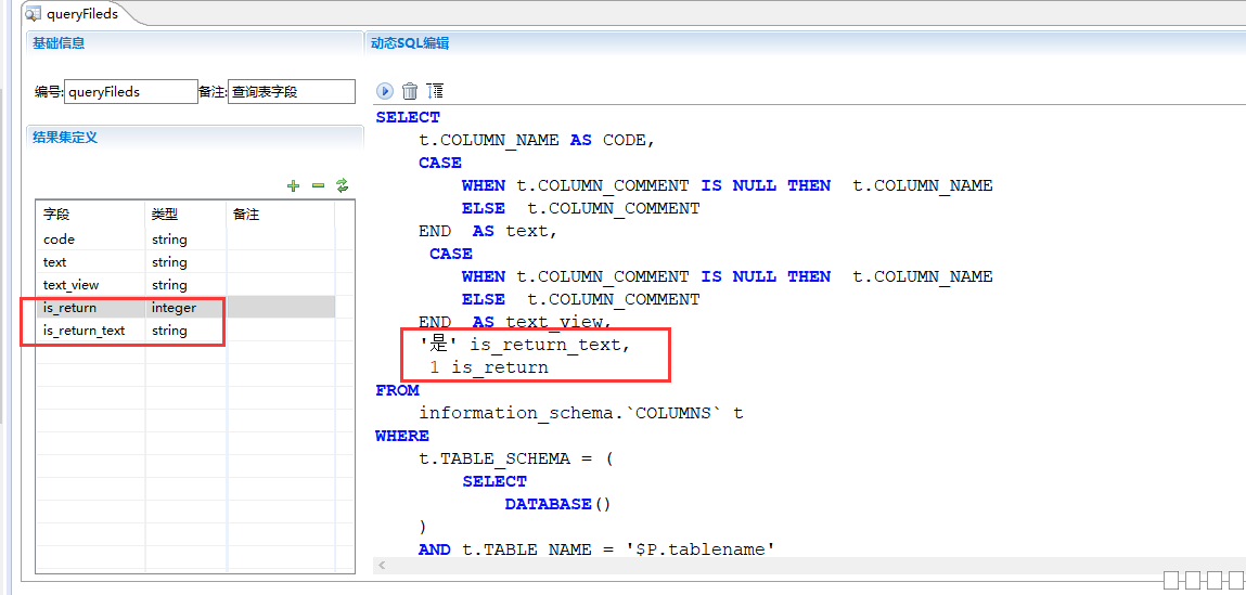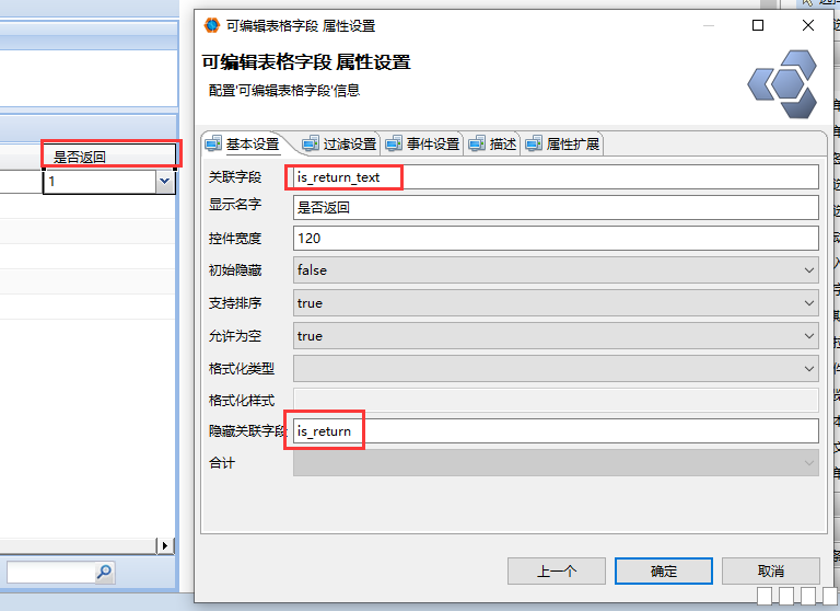 3. 表格项关联字段设置为返回的text,隐藏关联字段设置为下拉列表的code