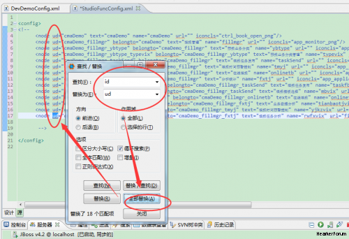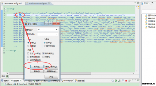 1.当前文件里面查找关键字【CTRL+F】: 1)例:查找"id",输入"id",点击查抄就会马上定位到有"id"关键字的地方了; 图片:QQ截图20150728091501.png 继续点击查找就会继续定位到下一个关键字的地方了; 图片:QQ截图20150728091714.png 2)【CTRL+F】还有个功能就是可以替换,有时会想把一个文件里面的一个关键字全部替换成另外的一个关键字,此时就需要这个功能了; a.一种就是你当前的焦点所在位置然后选择替换,会替换焦点位置的数据: 图片:QQ截图20150728092104.png b.另外一种就是选择全部替换,就会替换全部与关键字匹配的数据: 图片:QQ截图20150728092123.png 2.在整个工作的空间里面搜索文件【CTRL+SHIFT+R】,比如输入"u"就会出现很多的智能提示,然后就可以选择你想要搜索的文件了: 图片:QQ截图20150728092722.png 双击UserPurview.mix文件就可以定位到这个文件了: 图片:QQ截图20150728092844.png 3.在整个工作的空间搜索一个关键字,这时就要用到【CTRL+H】快捷键,比如要搜索"id"这个关键字: 上面那个是可以选择文件类型的,"."后面可以写成"*"就是搜索全部文件,如果写成".java"那就是搜索所有的java文件,以此类推; 图片:QQ截图20150728093217.png 搜索的结果会在"搜索"下面显示,会显示有多少条数据: 图片:QQ截图20150728093434.png |
