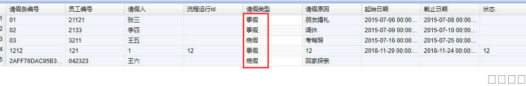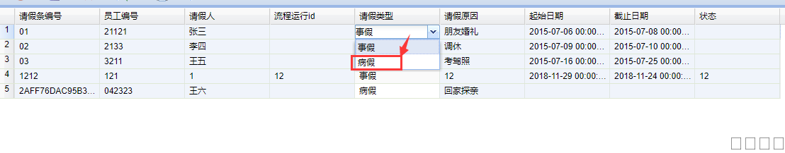 1. 给可编辑表格的下拉列表配置静态/动态数据源 图片:1.png 2. 在数据查询中根据下拉列表的code数据(1、2)查出text数据(事假、病假) 图片:2.png 3. 双击可编辑表格项将关联字段设置为返回text数据的字段,在隐藏关联字段中填写业务表中保存数据的字段 图片:3.png 4.页面显示效果 图片:4.png 5. 修改数据时保存的也为code数据 图片:5.png 图片:6.png |