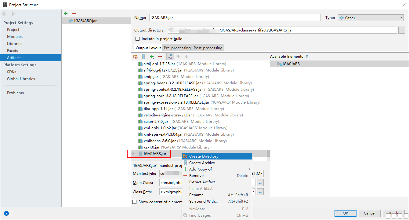 在Output Layout下面列出了打包后会生成的jar包,选择与项目同名的Jar包(注意与依赖jar包符号不同),右键 =》 Create Directory ,创建文件夹,名字为META-INF,