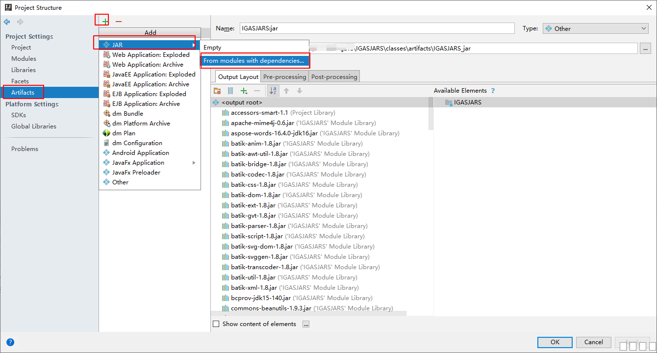 1. 工具栏依次选择: File =》 Project Structure => Artifacts => “+” =》 Jar =》 From modules with dependencies