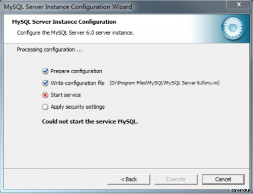 安装MYSQL6.0时,所有步骤都是按照百度教程来的,可是最后一步报错,说“服务器启动失败”。重复了几次都这样,这是为什么啊?