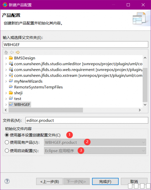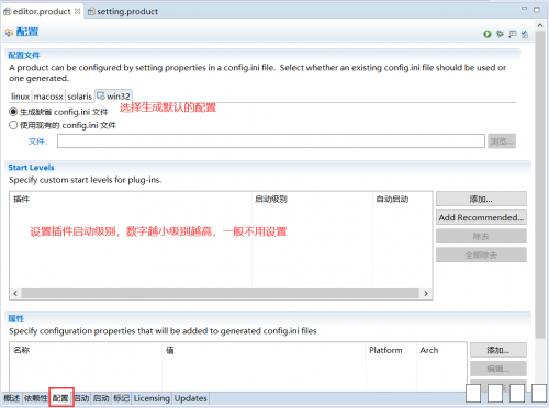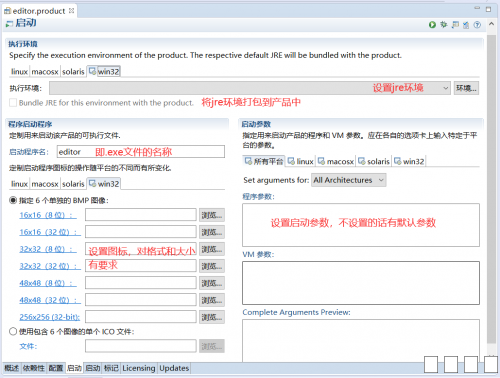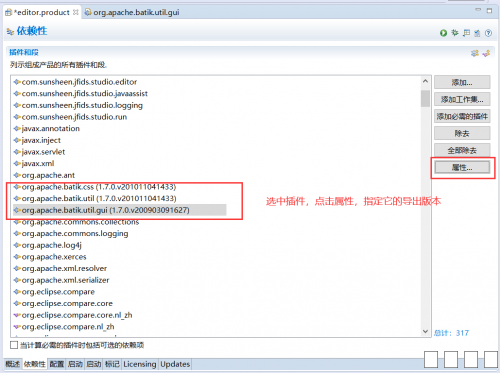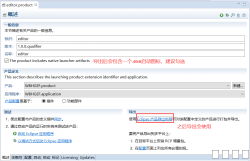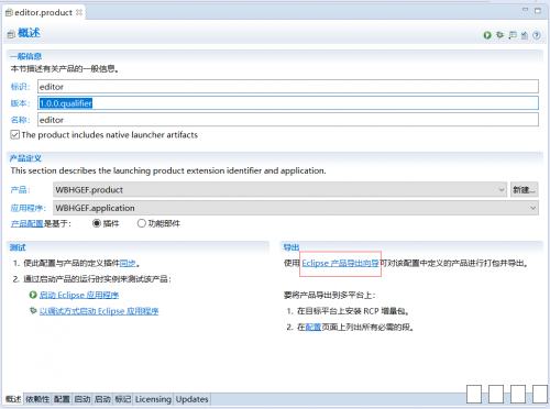 1.首先在项目上右键-》新建-》其它,在向导窗口中选择 插件开发-》产品配置(Product Configuration),如图 图片:1.png 2.点击下一步,选择父文件夹,输入文件名(随意),初始化文件内容建议选择1或2,这里选择1,点击完成 图片:2.png 3.进入刚创建的editor.product文件,首先打开的是概述页面 一、产品定义:产品选择对应的产品,应用程序也是 二、一般信息:标识和名称自己设置,版本一般为1.0.0或1.0.0.qualifier 图片:3.png 4.进入依赖性标页,现在这里是空的 一、先点击添加,将自己的项目作为插件添加进去 二、点击添加必需的插件,会自动添加依赖的插件 三、如果没有自动引入org.eclipse.equinox.event插件,需要自行添加,否则之后运行程序可能会报错 图片:4.png 5.进入配置页 图片:5.png 6.进入启动页 图片:6.png 7.回到概述页,点击Eclipse产品导出向导 图片:7.png 图片:8.png 8.导出完成后目录结构如下 图片:123.png 9.可能出现的错误 我在成功导出后,运行时发生了如下错误,这是缺少依赖 版本为1.7.0的包org.apacthe.batik.css 图片:10.png 但我查看导出后的plugins目录,却是有org.apache.batik.css_1.6.0.v201011041432.jar,这是版本不一致的问题 解决:查看刚才的导出配置 图片:11.png 如果有缺漏,欢迎大家指正 |