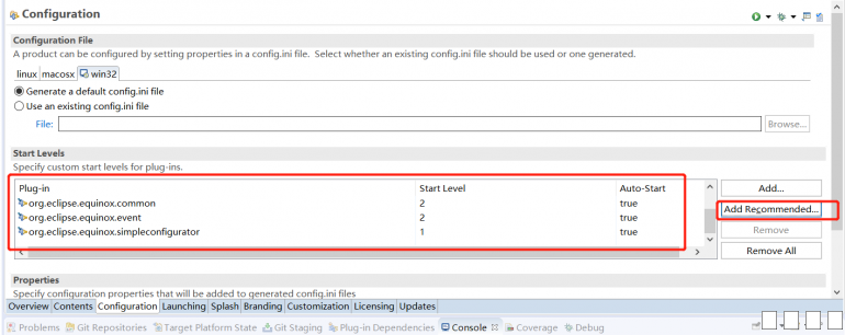 在configuration配置页中,使用Add Recommended按钮增加推荐的start levels,否则会造成导出后应用启动失败。 图片:QQ图片20200511161318.png |