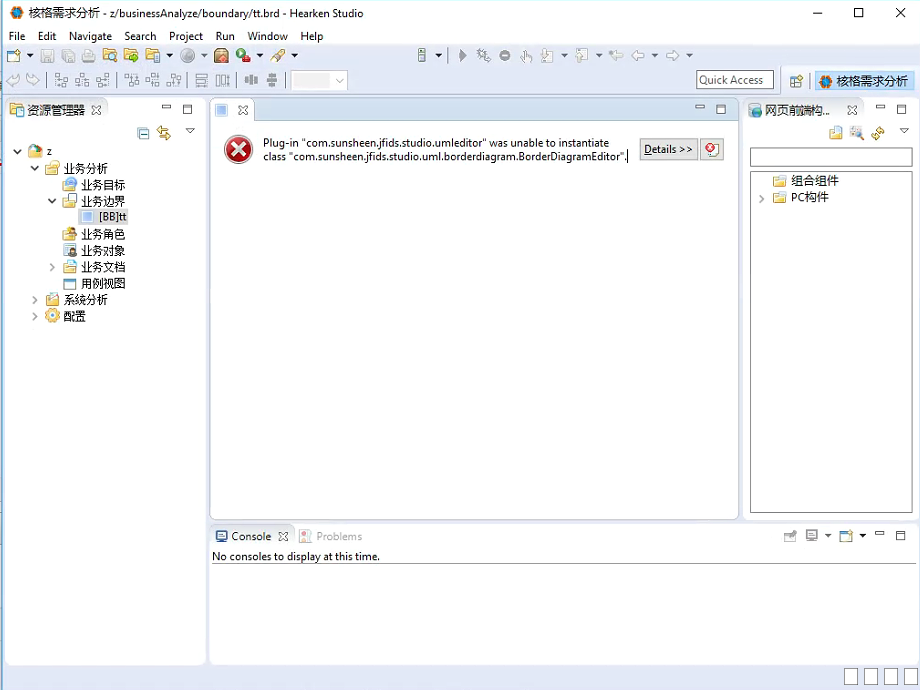 打开平台后新建业务边界后业务边界编辑器打开报错。