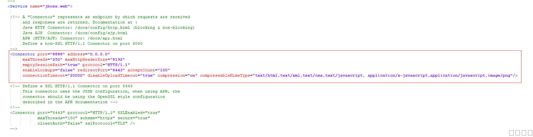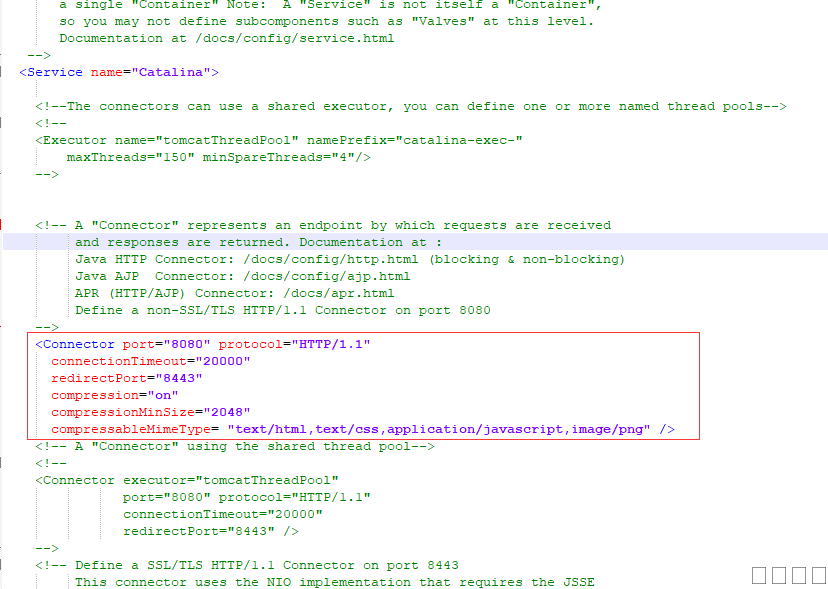 <connector port="8080" protocol="org.apache.coyote.http11.Http11Nio2Protocol" usesendfile="false" connectiontimeout="20000" redirectport="8443" executor="tomcatThreadPool" enablelookups="false" acceptcount="100" maxpostsize="10485760" compression="on" disableuploadtimeout="true" compressionminsize="2048" nocompressionuseragents="gozilla, traviata" acceptorthreadcount="2" compressablemimetype="text/html,text/xml,text/plain,text/css,text/javascript, application/javascript" uriencoding="utf-8" /> |