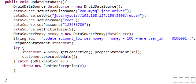 在分布事务中使用的数据源必须指定代理,目前数据源只能基于DruidDataSource,以后将支持任意数据源类型。数据源代理指定示例如下