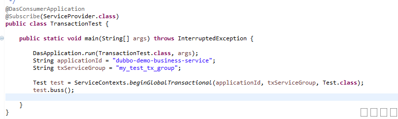 在需要开启全局事务的方法上添加注解@GlobalTransactional (com.sunsheen.jfids.das.core.annotation.GlobalTransactional),并在需要使用该方法时,通过<Test> Test com.sunsheen.jfids.das.core.context.ServiceContexts.beginGlobalTransactional(String applicationId, String txServiceGroup, Class<Test> clazz) 返回包含该方法的类实例。如图所示: