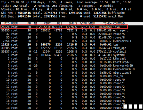 最近我的一个部署在centos7上的一个项目出现了CPU达到了1000%+的状态,导致项目崩溃,起初没重视,直接重启项目解决,后面项目运行了几天服务器又报警1000%+了,这个时候我才意识到项目问题的严重性。然后开始查找原因,查看数据库连接池,发现数据库连接已经爆满,超过了最大连接数,review代码,发现很多数据库操作的时候没有释放连接,改代码,重新部署。这个时候项目运行算比较稳定了,但是好景不长,过了一个星期左右CPU又1000%+了。苦恼了。在某一天晚上逛CSDN的时候突然看到一篇关于CPU调试的文章,怎么查看CPU进程的。正好服务器又爆了,已近爆太多次了,幸好项目没正式上线不然客户非吃了我。具体如下: