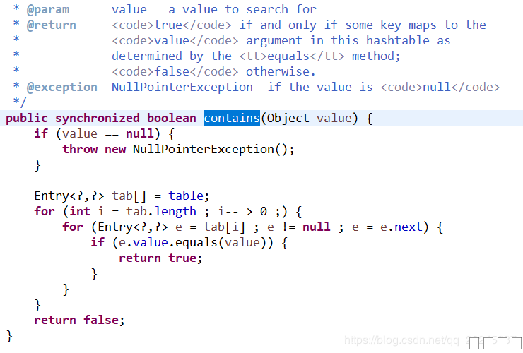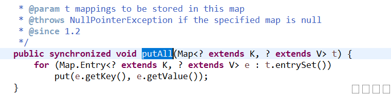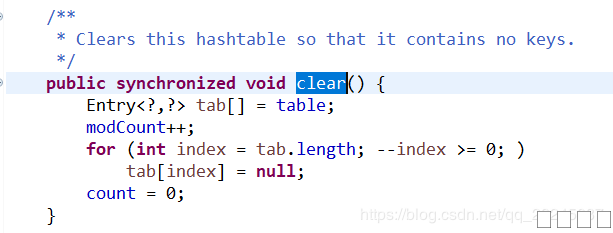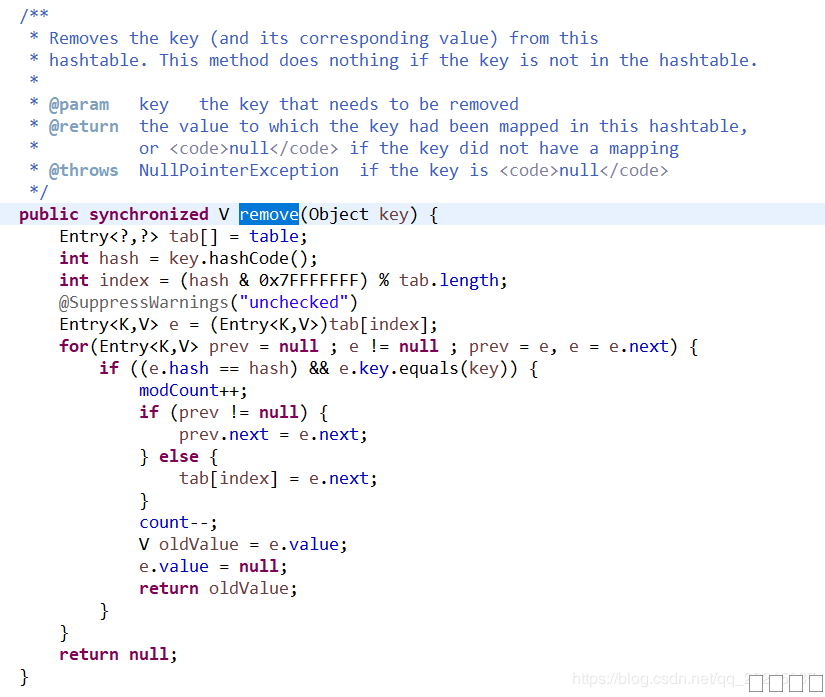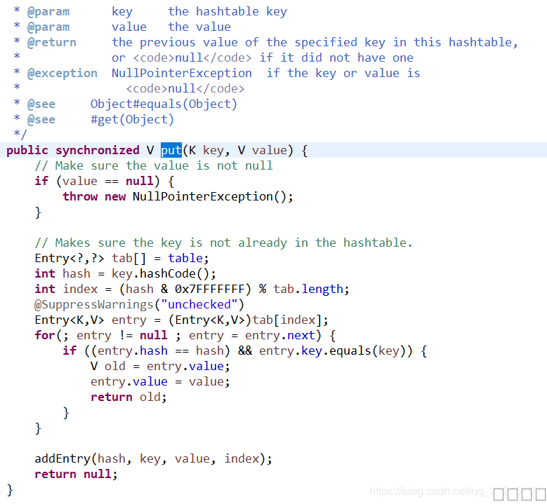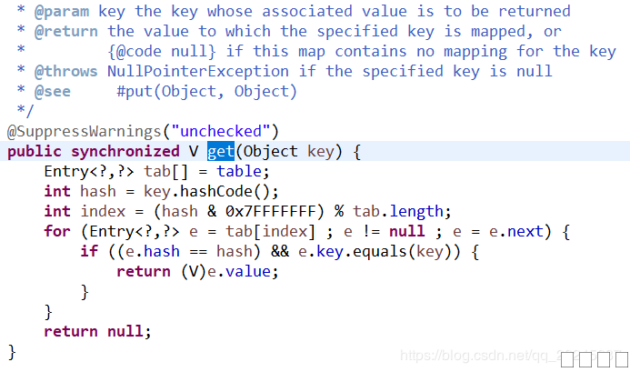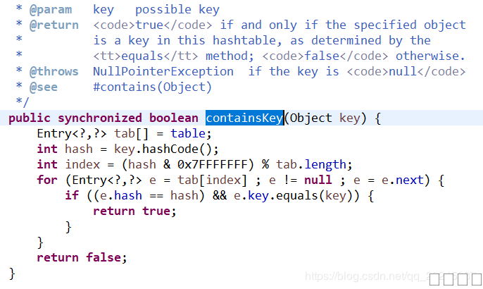 LET'S GO!我们先来看看这些问题,你的知道或了解多少呢! 1、什么是Hashtable? 2、Hashtable常用的接口方法有那些? 3、Hashtable有那些构造方法? 4、hashTable的成员变量有那些? 5、Hashtable的初始长度是多少? 6、为什么这样规定,设置这样的初始长度有什么意义? 7、Hashtable的存储和读取?8、Hashtable的几种遍历方式? 9、Hashtable和hashMap的区别有那些? 那么,接下来,让我们带着这些问题往下看,GO 一、什么是Hashtable? hashTable是基于哈希表的map接口的同步实现,它存储的数据都是键值对(key:value)映射,key和value的不允许存储null值,如遇到null值时会抛出空指针(NullPointExeeption)异常;key存储是唯一的,value的值可重复存储;hashTable存储的元素是无序的。 二、Hashtable常用的接口方法有那些? public class Hashtable<K,V> extends Dictionary<K,V> implements Map<K,V>, Cloneable, java.io.Serializable{} 从以上源码可以看出,hashtable继承于Dictionary类,实现了 Map,Cloneable,Serializable接口;Dictionary可以将键值映射到相应的值的类的抽象父类,每个键值对都是一个对象。 1、clear() 的作用是清空Hashtable。它是将Hashtable的table数组的值全部设为null;来看看源码 图片:1.png 2、contains() 和containsValue() 的作用都是判断Hashtable是否包含“值(value)”,返回true和false,如果值为null,会抛出空指针;来看看源码 图片:2.png 3、containsKey() 的作用是判断Hashtable是否包含key,如果存在则返回true,没有则返回false;来看看源码 图片:3.png 4、elements() 的作用是返回“所有value”的枚举对象; 5、get() 的作用就是获取key对应的value,没有的话返回null 图片:4.png 6、put() 的作用是对外提供接口,让Hashtable对象可以通过put()将“key-value”添加到Hashtable中; 图片:5.png 7、putAll() 的作用是将“Map(t)”的中全部元素逐一添加到Hashtable中; 图片:6.png 8、remove() 的作用是就是删除hashtable中键为key的元素; 图片:7.png 三、Hashtable有那些构造方法? hashTale共提供了4个构造方法: 1、public Hashtable(int initialCapacity, float loadFactor): 用指定初始容量和指定加载因子构造一个新的空哈希表 2、public Hashtable(int initialCapacity):用来指定初始容量和默认的加载因子 (0.75) 构造一个新的空哈希表 3、public Hashtable():默认构造函数,容量为 11,加载因子为 0.75 4、public Hashtable(Map< ? extends K, ? extends V> t):构造一个与给定的Map具有相同映射关系的新哈希表 四、Hashtable的成员变量有那些? hashTale共提供了5个成员变量: 1、 table:一个Entry[]数组类型,而Entry(在 HashMap 中有讲解过)就是一个单向链表。哈希表的”key-value键值对”都是存储在Entry数组中的 2、count:Hashtable的大小,它是Hashtable保存的键值对的数量 3、threshold:Hashtable的阈值,用于判断是否需要调整Hashtable的容量,threshold的值 = (容量 * 负载因子) 4、loadFactor:负载因子 5、modCount:用来实现fail-fast机制的 五、Hashtable的初始长度是多少? hastable的初始长度为11;每一次扩容时,都是现在的容量*负载因子;负载因子等于0.75; 六、为什么这样规定,设置这样的初始长度有什么意义? 影响hashtable的实例性能的参数有两个,就是初始容量和加载因子。容量其实就是哈希表中桶的数量,初始容量就是哈希表中初始创建时的容量大小,在发生哈希冲突的情况下,单个桶会存储多个条目,这些条目必须按顺序搜索。加载因子是对哈希表在其容量自动增加之前能够连到多满的一个尺度。通常,默认加载因子是0.75,就是在空间和时间上录求一种折中。当加载因子过高时,虽然减少了空间的开锁,但同时也增加了某个条目的查找时间。 七、Hashtable的存储和读取? 1、put():hashtable并不允许键和值为空(null)若设置为空值,会抛出空指针。HashMap计算的是h&(length-1),hashtable用的是模运算,效率上是低于hashMap的。hashtable计算索引时将hash值先与Ox7FFFFFF,这是为了保证hash值始终为正数,hashtable的方法都是加上关键字 synchronized的,也就是说这个hashtable是线程安全的;hashtable的每次扩容都是原来的2倍加1,而hashMap为原来的2倍。 2、get():根据传入的key值获取key对应的value值。如果传的值是null的话,会抛出空指针异常。 八、Hashtable几种遍历方式? 请看如下示例代码: Hashtable<String, Object> table = new Hashtable<>(); table.put("abc", 12345); table.put("bc", 125); // 1、使用keys() 获取key值 Enumeration<String> en1 = table.keys(); while (en1.hasMoreElements()) { System.out.println(en1.nextElement()); } // 2、使用elements() 获取value值 Enumeration<Object> en2 = table.elements(); while (en2.hasMoreElements()) { System.out.println(en2.nextElement()); } // 3、使用keySet() 获取key值 Iterator<String> it1 = table.keySet().iterator(); while (it1.hasNext()) { System.out.println(it1.next()); } // 4、使用entrySet() 获取map的key=value值 Iterator<Entry<String, Object>> it2 = table.entrySet().iterator(); while (it2.hasNext()) { System.out.println(it2.next()); System.out.println(it2.next().getValue()); System.out.println(it2.next().getKey()); } 九、Hashtable和hashMap的区别有那些? 1、hashtable是线程安全的,hashMap不是线程安全的。 2、hashtable并不允许键和值为null,若为空会抛出空指针异常;hashMap则是可以 的,当调用遇到key为null的时候,调用putForNullKey方法进行处理,而对value没有处理。 3、hashtable和hashMap一样,不允许插入键一样的值,若插入一样的,则新的值会覆盖旧的值。 4、hashtable也是通过链表来解决冲突的。 5、hashtable的容量为任意正数(最小为1),hashMap的容量 始终为2的n次方;hashtable的容量默认为11,而hashMa