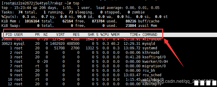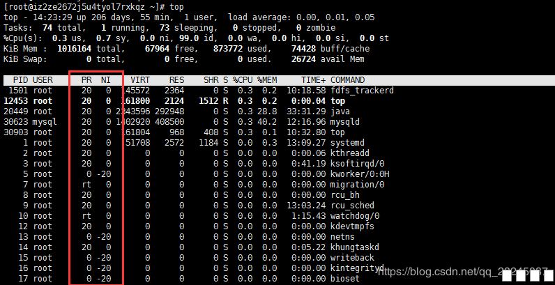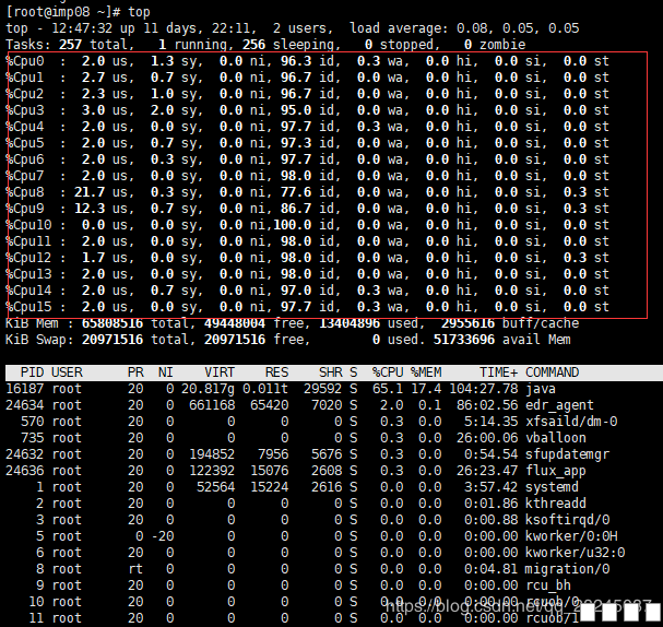 图1: 图片:1.png 一、进程的七种状态 (1)、R运行状态(runing):并不意味着进程一定在运行中,也可以在运行队列里; (2)、S睡眠状态(sleeping):进程在等待事件完成;(浅度睡眠,可以被唤醒); (3)、D磁盘睡眠状态(Disk sleep):不可中断睡眠(深度睡眠,不可以被唤醒,通常在磁盘写入时发生); (4)、T停止状态(stopped):可以通过发送SIGSTOP信号给进程来停止进程,可以发送SIGCONT信号让进程继续运行; (5)、X死亡状态(dead):该状态是返回状态,在任务列表中看不到; (6)、Z僵尸状态(zombie):子进程退出,父进程还在运行,但是父进程没有读到子进程的退出状态,子进程进入僵尸状态; (7)、t追踪停止状态(trancing stop); 查看进程的状态命令:ps aux | grep pid | grep -v grep 如图:查询的是sshd进程的状态 图片:2.png PS: 僵尸进程的危害 1 上面说到僵尸进程是由于父进程没有读取到子进程的退出信息而产生的,那么我们是不是就可以理解为父进程一直以为处于僵尸状态的子进程是没有退出的。而进程是需要维护的,僵尸进程就会一直需要PCB对其进行维护; 2 浪费内存资源。如果僵尸进程一直没有退出,就会一直占用这块内存,就会导致内存资源的浪费; 3 内存泄漏。僵尸进程一直占用资源,但是却不使用,就可能会导致内存泄漏。 二、进程的优先级 分别为nice值和Priority值 当我们使用top命令查询进程时,如图红色框中的值即是nice值和Priority 图片:3.png 1) nice值 反应一个进程“优先级”状态的值 取值范围是 -20 ~ 19, 40个级别 nice值越小,“优先级”越高 2) Priority值 优先级值 linux上实现了140个优先级范围,取值是从0~139 0 ~ 99表示实时进程;100 ~ 139表示非实时进程 三、进程操作的常用命令 1、常用的进程动态查看命令ps 1)、常用命令组合 ps aux ,该命令组合和ps -ef组合功能一样 a:与终端有关的进程,用户通过终端启动,退出shell时,进程会终止。 x:与终端无关的进程,系统启动过程中自动启动的进程。 u:以用户为中心组织进程状态显示 图片:4.png 2、常用top命令 1)、语法:top [options] 2)、参数: -d #:指定刷新时间间隔,默认5秒 -n #:指定刷新批次,即指定刷新次数,刷新完成后自动退出 -b:以批次方式显示 3)、当使用top命令输出时,可以使用如下命令对输出结果进行操作 a、排序相关 P:占CPU百分比%CPU排序 M:占内存百分比%MEM排序 T:累计占用CPU时间TIME+排序 b、 开关相关 l:第一行uptime信息开关 t:第二行tasks和第三行cpu信息开关 m:第四行mem和第五行swap信息开关 4)、top 查询结果前5行参数详细说明 图片:5.png 第 一行 分别显示:系统当前时间 系统运行时间 当前用户登陆数 系统负载。*系统负载(load average),这里有三个数值,分别 是系统最近1分钟,5分钟,15分钟的平均负载。一般对于单个处理器来说,负载在0 — 1.00 之间是正常的,超过1.00就要引起注意了。在多核处理器中,你的系统均值不应该高于处理器核心的总数。 第二行 分别显示:total进程总数、 running正在运行的进程数、 sleeping睡眠的进程数、stopped停止的进程数、 zombie僵尸进程数。 第三行分别显示: %us 用户空间占用CPU百分比、 %sy 内核空间占用CPU百分比、 %ni 用户进程空间内改变过优先级的进程占用CPU百分比、 %id 空闲CPU百分比、 %wa 等待输入输出(I/O)的CPU时间百分比 、 %hi指的是cpu处理硬件中断的时间、%si指的是cpu处理软中断的时间 、 %st用于有虚拟cpu的情况,用来指示被虚拟机偷掉的cpu时间。 通常id%值可以反映一个系统cpu的闲忙程度。 第四行 MEM :total 物理内存总量、 used 使用的物理内存总量、free 空闲内存总量、 buffers 用作内核缓存的内存量。 第五行 SWAP:total 交换区总量、 used 使用的交换区总量、free 空闲交换区总量、 cached 缓冲的交换区总量。 PS:buffers和cached的区别需要说明一下,buffers指的是块设备的读写缓冲区,cached指的是文件系统本身的页面缓存。它们都是linux操作系统底层的机制,目的就是为了加速对磁盘的访问。 5)、使用top命令得到的结果及列的参数说明 图片:6.png 红色框里的值对应代表意思如下: PID:进程号 USER:进程属主 PR:priority 的简写,进程优先级 NI:nice的简写,与PR值联合控制进程的优先级 VIRT:进程使用的虚拟内存总量,单位kb。VIRT=SWAP+RES RES:进程使用的、未被换出的物理内存大小,单位kb。RES=CODE+DATA SHR:共享内存大小,单位kb S:进程状态。 %CPU:CPU使用率。 %MEM:内存使用率。 TIME+:CPU使用时间累和,即进程一共占用CPU多久 COMMAND:进程对应的命令 3)、pgrep命令 常用参数: -o:仅显示找到的最小(起始)进程号; -n:仅显示找到的最大(结束)进程号; -l:显示进程名称; -P:指定父进程号; -g:指定进程组; -t:指定开启进程的终端; -u:指定进程的有效用户ID。 4)、pstree命令 pstree指令用ASCII字符显示树状结构,清楚地表达程序间的相互关系。如果不指定程序识别码或用户名称,则会把系统启动时的第一个程序视为基层,并显示之后的所有程序。若指定用户名称,便会以隶属该用户的第一个程序当作基层,然后显示该用户的所有程序。 常用参数: -a 显示每个程序的完整指令,包含路径,参数或是常驻服务的标示。 -c 不使用精简标示法。 -G 使用VT100终端机的列绘图字符。 -h 列出树状图时,特别标明现在执行的程序。 -H<程序识别码> 此参数的效果和指定"-h"参数类似,但特别标明指定的程序。 -l 采用长列格式显示树状图。 -n 用程序识别码排序。预设是以程序名称来排序。 -p 显示程序识别