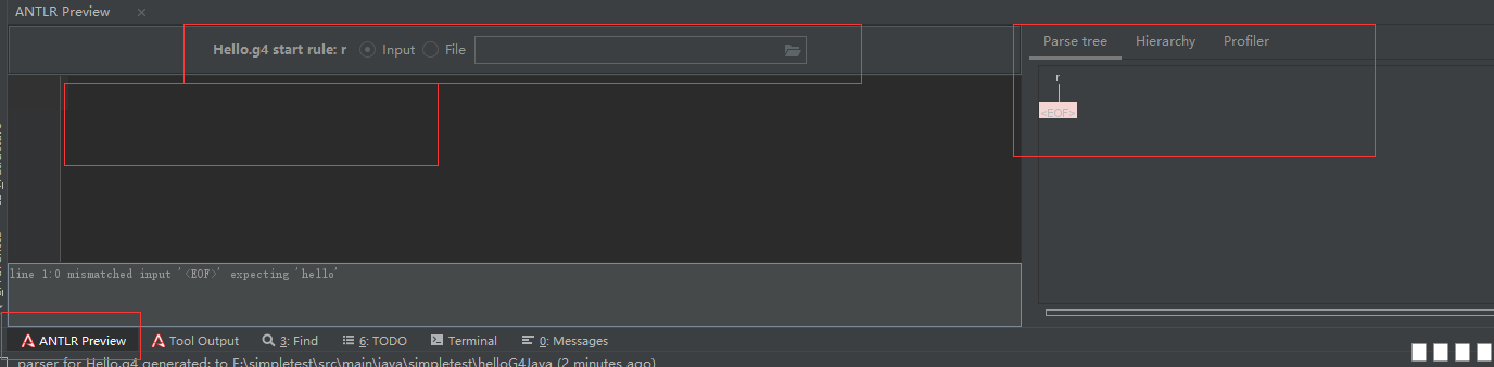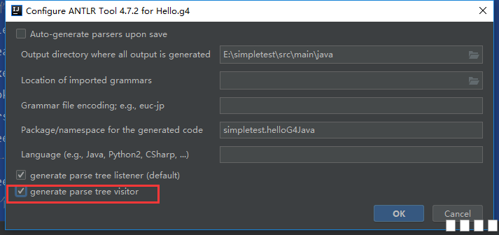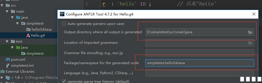 <groupId>org.antlr</groupId> <artifactId>antlr4-runtime</artifactId> <version>4.7.2</version> </dependency> 一 .Antlr是什么 Antlr是一款用java语言开发的语法分析生成工具。二.Antlr有什么作用 Antlr可用来读取、处理、执行和翻译结构化的文本或二进制文件。三.Antlr语法 1.示例: 在环境准备中创建的项目下新建一个文件,命名为Hello.g4 grammar Hello; r : 'hello' ID ; // 匹配'hello' ID : [a-z]+ ; // 匹配小写字母 WS : [ \t\r\n]+ -> skip ; // 跳过空格、制表符和换行 之后配置Antlr代码生成选项,在g4文件上右键,选择“Configure ANTLR...”选项,弹出配置窗口 图片:antlr04.png 配置好后右键g4文件,选择“Generate ANTLR Recognizer”选项 此时可以看到,Antlr自动在我们配置的目录下生成了一系列的文件: 图片:abtlr06.png