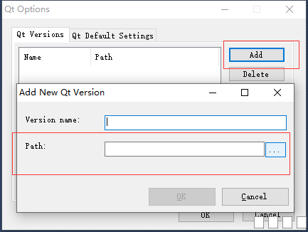 点击add按钮,然后点击Path后面的三个后,选择Qt的安装路径,如下图所示;