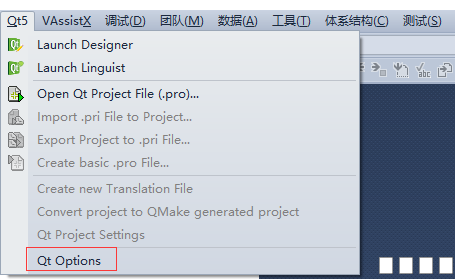 如图在菜单栏会出现Qt5的菜单,点击之后,我们选择图示红色方框的进入;弹出如下图所示对话框。