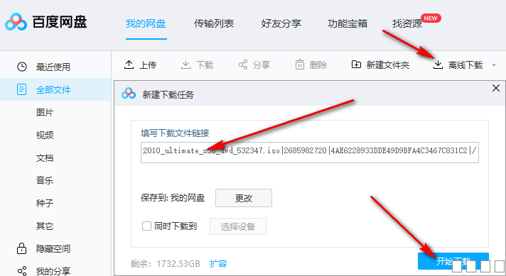 打开“百度云盘”,点击图示的“离线下载”,粘贴从上图所示的地方的链接地址,点击“开始下载”,保存到了百度云盘,然后在百度云盘中找到,即可下载。