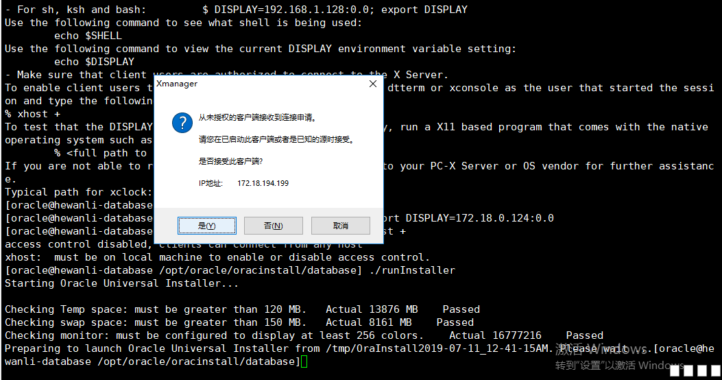 (下载地址:链接链接:https://pan.baidu.com/s/1t-wZW7oT6UIH78YCYsLVGw 提取码:juzh) 备注:Xmanager 主要是配置安装oracle的图形化界面。 第一步:安装前服务器系统硬件软件检查 1.系统内存检查 命令:grep MemTotal /proc/meminfo 描述:3 图片:1.png 计算出来有3882428内存,满足Oracle 的内存安装要求。 2.查询系统位数命令:# uname -m 3. 查询系统版本命令:# cat /proc/version 4.查询系统内核版本:# uname -r 描述:2 图片:2.png 服务器系统版本和内核版本都在Oracle 11g支持的范围内 5.磁盘空间要求 :#df -h(一般情况下,这个都不是问题) 6./tmp空间至少1GB,查询命令:# df -h /tmp 7.命令:# df -h 查看各个磁盘的使用情况 第二步:安装前系统配置 1.检查Oracle需要的rpm安装情况 命令:rpm -q binutils compat-libcap1 compat-libstdc++-33 gcc gcc-c++ glibc glibc-devel ksh libaio libaio-devel libgcc libstdc++ libstdc++-devel libXext libXtst libX11 libXau libxcb libXi make sysstat 备注:(我已经安装成功,你检查出来可能不同) 图片:4.png 2.安装缺失的rpm 命令:yum -y install binutils compat-libcap1 compat-libstdc++-33 compat-libstdc++-33*.i686 elfutilslibelf-devel gcc gcc-c++ glibc*.i686 glibc glibc-devel glibc-devel*.i686 ksh libgcc*.i686 libgcc libstdc++ libstdc++*.i686 libstdc++-devel libstdc++-devel*.i686 libaio libaio*.i686 libaio-devel libaio-devel*.i686 make sysstat unixODBC unixODBC*.i686 unixODBC-devel unixODBCdevel*.i686 libXp 备注:我已经安装所以提示已经是最新版 图片:4.png 第三步:创建用户、用户组以及安装目录 安装和运行Oracle数据库都需要使用指定用户组内的指定用户,这里我用户为Oracle,,用户组建为oinstall、dba,oinstall组中的成员用于管理Oracle数据库物理软件,dba组中的成员用于管理、操作数据库,具有sysdba权限。 1.命令: groupadd oinstall ----创建oracle用户组 2.命令: groupadd dba----创建oracle用户组 3.命令: useradd -g oinstall -G dba oracle----oracle加入新建的2个用户组 4.命令: passwd oracle ----设置oracle用户的密码 5.命令: mkdir -p /usr/oracle ----创建oracle安装目录 6.命令: mkdir -p /opt/oracle/oracinstall ---创建racle安装文件所在目录 7.命令: chown -R oracle:oinstall /usr/oracle ----更改oracle目录用户组 8.命令: chmod -R 775 /usr/oracle ----更改oracle目录权限 9.命令: chown -R oracle:oinstall /opt/oracle/oracinstall----更改oracle安装文件所在目录的用户组 10.命令:chmod -R 755 /opt/oracle/oracinstall----更改oracleracle安装文件所在目录的操作权限 第四步:配置系统内核参数 1.编辑系统内核参数(文件的末尾加入内核要求内容) 命令: vi /etc/sysctl.conf 编辑内核 kernel.shmall = 2097152 kernel.shmmax = 2147483648 kernel.shmmni = 4096 kernel.sem = 250 32000 100 128 net.ipv4.ip_local_port_range = 9000 65500 net.core.rmem_default = 4194304 net.core.rmem_max = 4194304 net.core.wmem_default = 262144 net.core.wmem_max = 1048586 fs.file-max = 6815744 图片:5.png 2.生效新配置的系统内核参数 命令:sysctl -p 3.配置Oracle用户shell limit 命令:vi /etc/security/limits.conf noproc - 进程的最大数目 stack - 最大栈大小 nofile - 打开文件的最大数目 soft 当前系统生效的设置值 hard 系统中所能设定的最大值 soft 的限制不能比har 限制高。用 - 就表明同时设置了 soft 和 hard 的值。 oracle:被限制的用户名,组名前面加@和用户名区别 修改值如下: oracle soft nproc 2047 oracle hard nproc 16384 oracle soft nofile 1024 oracle hard nofile 65536 oracle soft stack 10240 oracle hard stack 10240 图片:6.png 4.编辑登录配置文件 命令:vi /etc/pam.d/login 在文本最后添加:session required pam_limits.so 使shell limit生效。 图片:7.png 第五步:Oracle用户环境变量配置 必须在Oracle用户的.bash_profile文件中设置ORACLE_BASE、ORACLE_HOME、ORACLE_SID和PATH环境变量,其他的根据需要来设置。ORACLE_HOME可以在安装前手动配置,另外,Oracle安装过程中会根据ORACLE_BASE的值自动指定的ORACLE_HOME,所以也可以在安装后将这个ORACLE_HOME写入.bash_profile。 1.从root切换到oracle 命令:su - oracle 2.命令:vi .bash_profile 添加以下内容保存退出 export ORACLE_BASE=/usr/oracle export ORACLE_HOME=$ORACLE_BASE/product export ORACLE_SID=orcl export PATH=$PATH:$HOME/bin:$ORACLE_HOME/bin export LD_LIBRARY_PATH=$ORACLE_HOME/lib:/usr/lib export LANG=en_US if [ $USER = "oracle" ];then if [ $SHELL = "/bin/ksh" ];then ulimit -p 16384 ulimit -n 65536 else ulimit -u 16384 -n 65536 fi fi 3.生成配置文件 命令:source .bash_profile 4.(切回用户)root 配置修改/etc/hosts文件 命令:vi /etc/hosts 在文件末尾加上本机实际IP和主机用户名如: 196.160.1.211 Centos dbserver5.执行命令:xhost + 出错:xhost: unable to open display “” 解决办法; 命令:yum install tigervnc-server vncserver export DISPLAY=172.18.194.199:00(这里的IP为安装Xmanager 6的本机地址) xhost + 6.//切换到oracle用户下命令: su - oracle//查看当前DISPLAY环境变量的值命令:echo $DISPLAY //允许视图界面投影到设定的ip下,命令:export DISPLAY=172.18.194.199:0.0(IP为安装Xmanager 的本机地址) //再次查看DISPLAY环境变量的值,命令:echo $DISPLAY//启动命令:xhost + 7.出现问题:xhost: unable to open display “172.18.194.199:0.0” 解决办法:1.安装Xmanager 6 2.链接Linux服务器 注意:在远程执行命令行里输入: /usr/bin/xterm -ls -display $DISPLAY 图片:3123.png 再次使用Xshell命令行尝试,命令:xhost + 出现成功的响应: access control disabled, clients can connect from any host(表示成功) 图片:66663324.png 第六步:安装oracle 11g数据库1.使用WinSCP工具将两个oracle压缩包放到Linux中 我这里使用的目录是:/opt/oracle/oracinstall 2.解压缩 执行命令:yum install -y unzip zip解压命令:unzip linux.x64_11gR2_data
