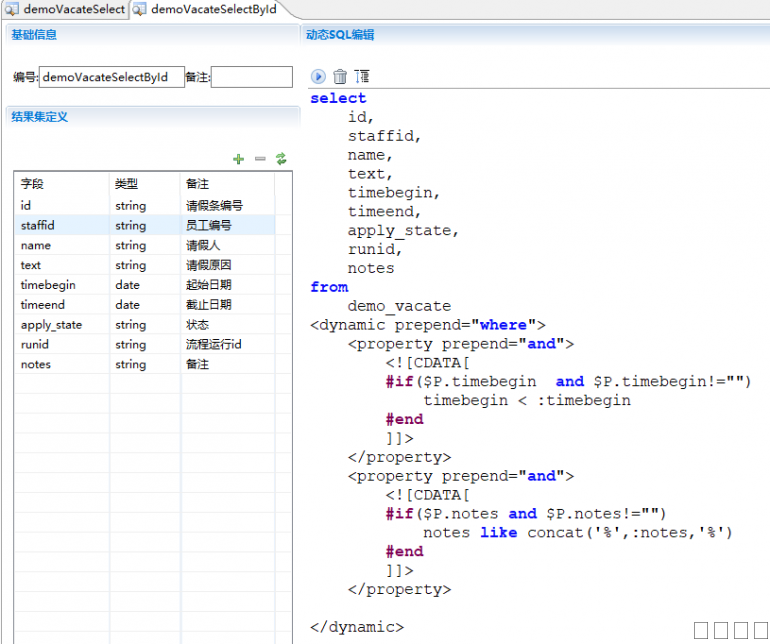 图片:1.png 2. 数据查询语句: 图片:2.png 代码如下: select id, staffid, name, text, timebegin, timeend, apply_state, runid, notes from demo_vacate <dynamic prepend="where"> <property prepend="and"> <![CDATA[ #if($P.timebegin and $P.timebegin!="") timebegin < :timebegin #end ]]> </property> <property prepend="and"> <![CDATA[ #if($P.notes and $P.notes!="") notes like concat('%',:notes,'%') #end ]]> </property> </dynamic> 注意:生成的查询语句中不能使用$P取值,否则会出现sql注入漏洞 |